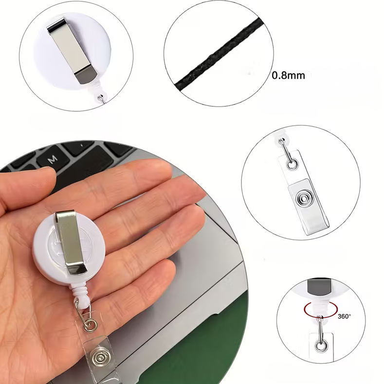 výsuvný držiak s 360° otočným klipom, rollerom, vinylovým pásikom s patentkou na upevnenie menoviek, preukazov atď. Doklady sú dobre viditeľné a pripravené na používanie.